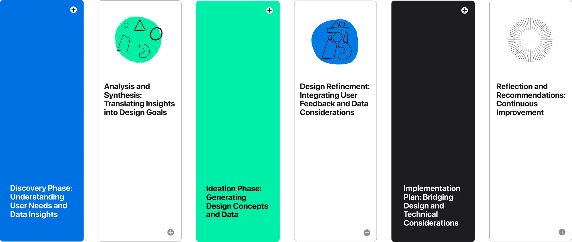 The initial phase involved discovery, where I delved into understanding user needs and data insights. Following that, the analysis and synthesis phase aimed to transform those user and data insights into tangible design goals. Moving into the ideation phase, I translated these goals into low-fidelity wireframes and concepts.