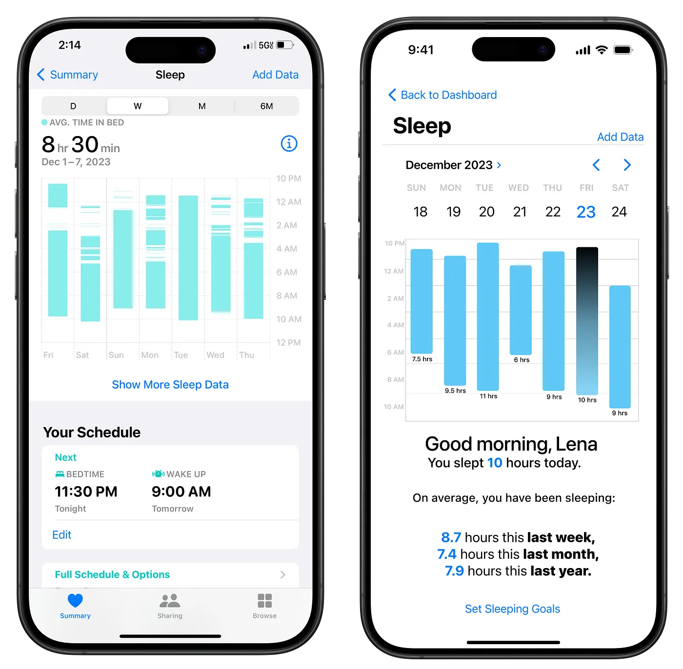 Moving on to the sleep metric, the current setup involves visualizations utilizing stacked bar charts, depicting details such as time spent in bed and time asleep. Applying consistent design principles and insights gained earlier, coupled with features observed in high-performing apps, I developed an enhanced version of the sleep mode.