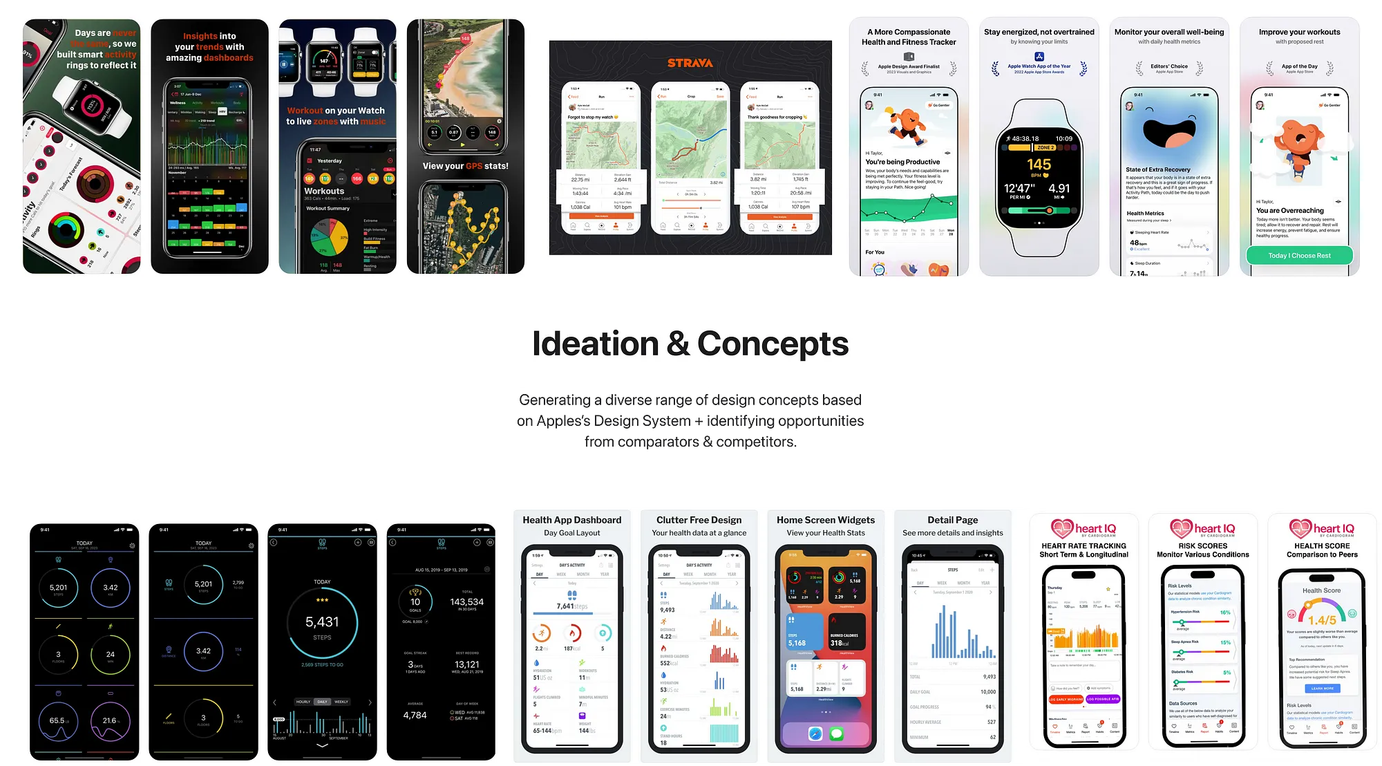 Now, continuing on with the ideation concept phase, my next goal was to identify opportunities from Apple’s competitors. I explored the App Store to discover popular health and fitness applications, focusing on the top six with features similar to Apple’s Health app. Drawing inspiration, I contemplated certain features to enhance Apple’s application. Additionally, I adhered to Apple’s design system and human interface guidelines while designing and updating the current app.