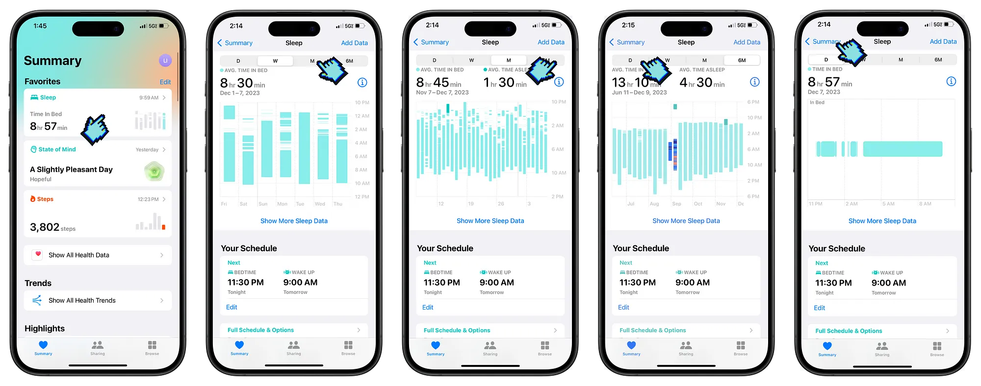 Here’s the initial experience when you open the Apple Health application. The first screen displays a summary of your health data, showcasing information you manually inputted or automatically gathered from your phone. You can click “Show All Health Data” to explore various metrics or choose “Show Health Trends” at the bottom. The navigation bar lets you view health stats, share data, or explore reblogs and third-party applications. For my iteration, I decided I’ll focus on the starting dashboard and the sleep metric.