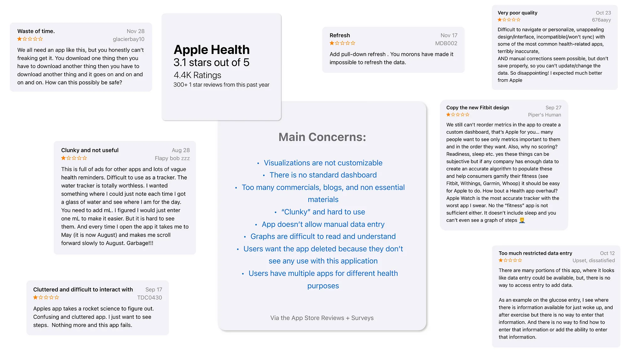 I embarked on two distinct research approaches to kick off the research phase. First, I conducted a survey targeting individuals using health and fitness apps, seeking insights into their preferences, usage patterns, and expectations from these applications. Simultaneously, I manually analyzed reviews, focusing specifically on one and two-star ratings from the past year and a half sourced from the Apple App Store. This qualitative examination aimed to uncover the specific challenges faced by Apple’s Health application users as expressed in their reviews on the platform.