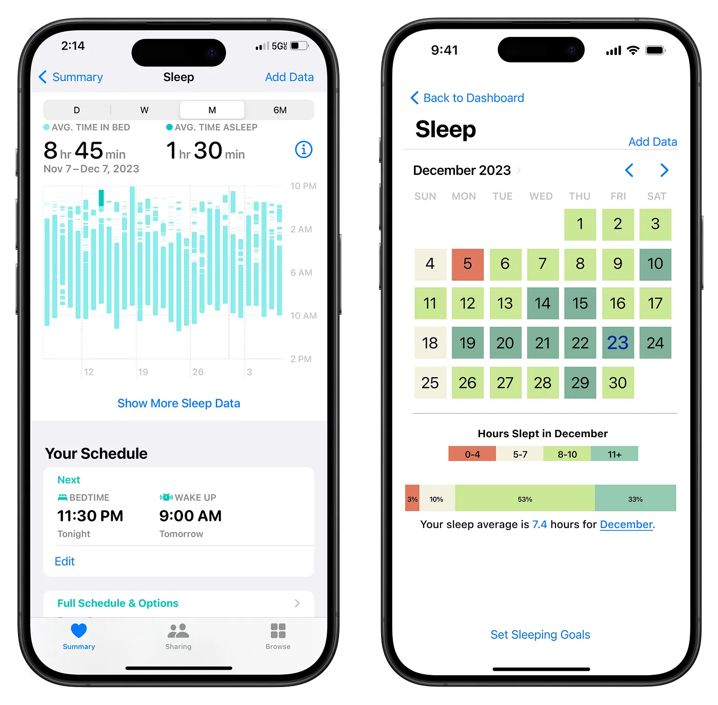 Clicking on the “sleep” metric provides a week overview. The top section of the screen offers a toggle for day, week, month, or six months, along with displaying time in bed on the right axis using a stacked bar chart. Apple uses this visualization to depict when you’re in bed or sleeping, with different metrics for light and deep sleep. The bottom axis covers the last seven days, with an option to view more sleep data. Users can manually add data or adjust alarms and schedules as they scroll down.