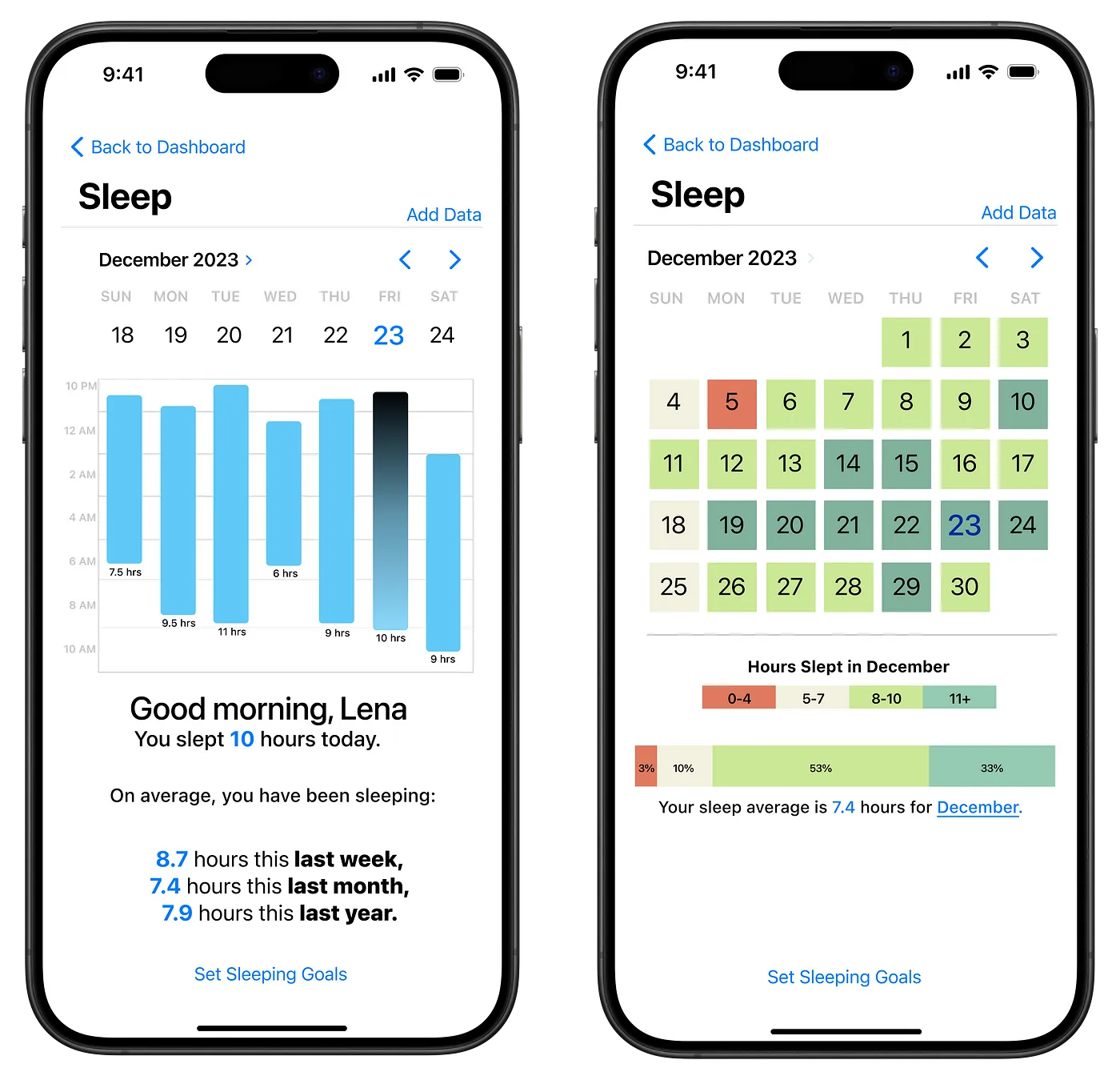 To further enhance usability, an average sleep duration for the entire month is provided, and users can easily toggle between different durations by clicking on the month. This one-screen solution empowers users to grasp multiple insights effortlessly, eliminating the need for scrolling, extra clicks, or zooming in on graphs.