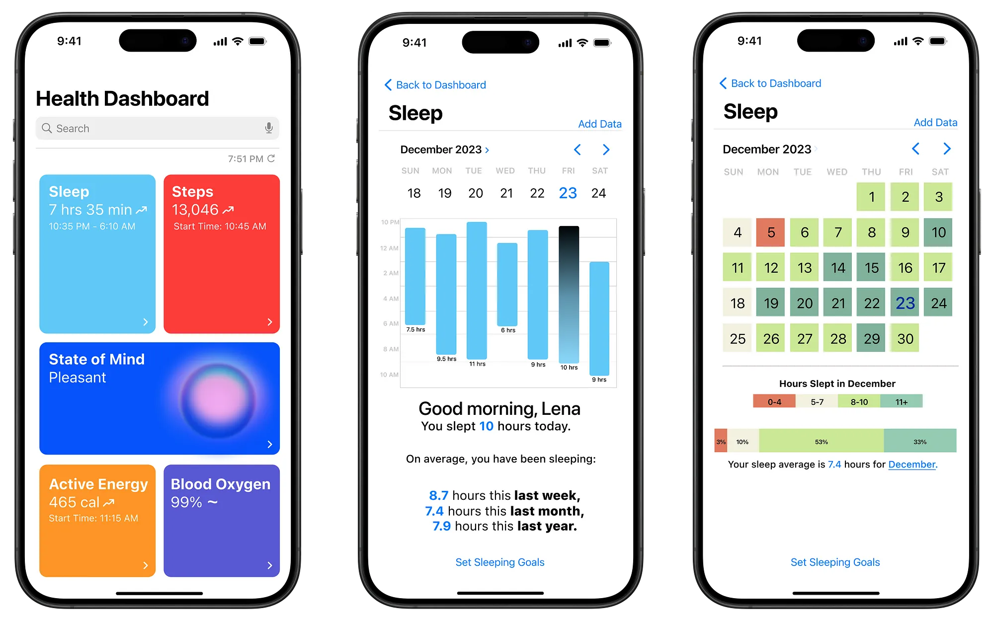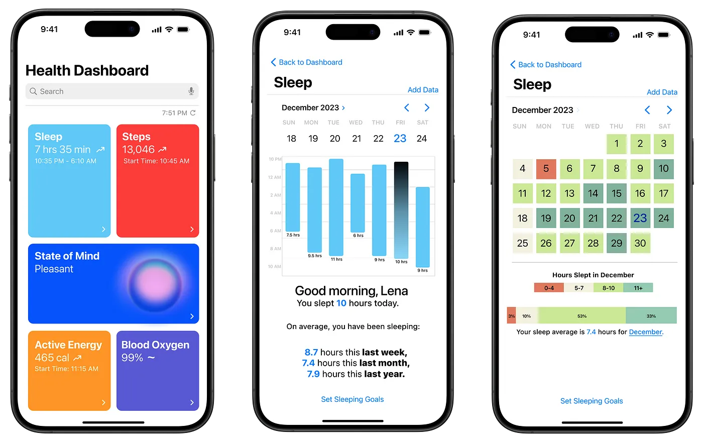 These serve as my final designs for the revamped Apple Health main dashboard and sleep metrics. The aim was to elevate user experience by offering a visually appealing, user-friendly interface that caters to diverse preferences and needs.