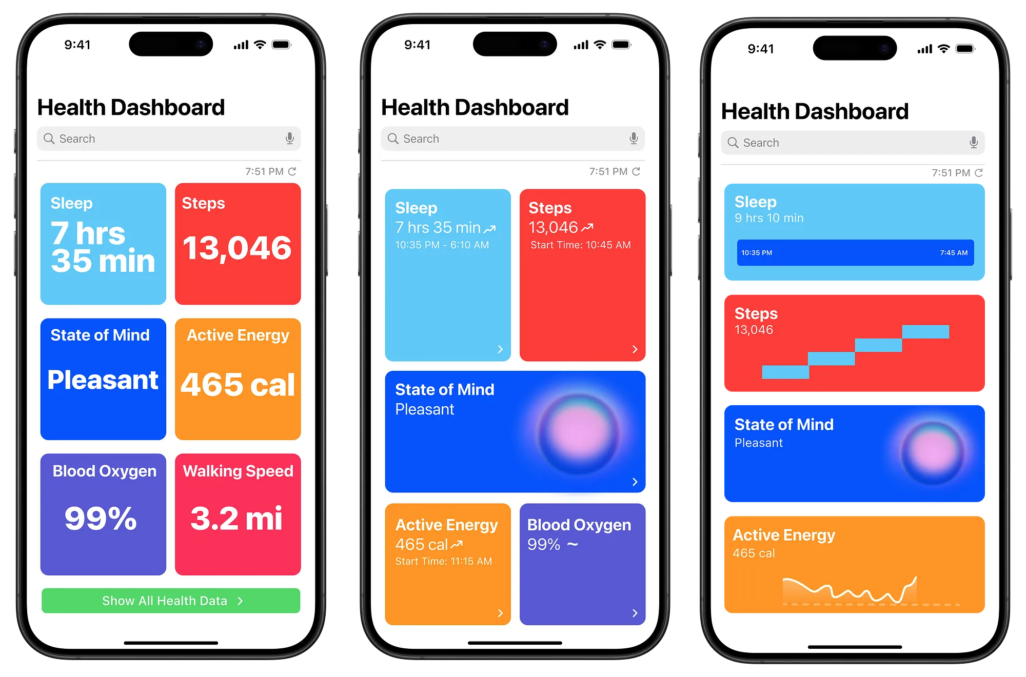 The left design caters to someone like Angie, who prefers a quick and straightforward glance at a few key stats without delving deep into health data. It provides an overview of essential metrics such as sleep and steps. The middle design is geared towards Sarah, providing a comprehensive snapshot of all crucial metrics with a single click, including finer details like sleep duration, bedtime, changes in sleep patterns, and the commencement of physical activities. The right design suits Alex, offering a visually engaging interface with pertinent information, avoiding information overload.