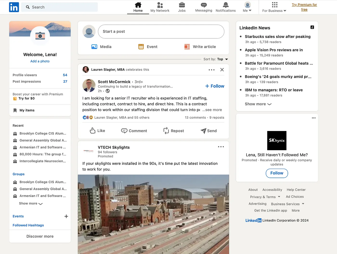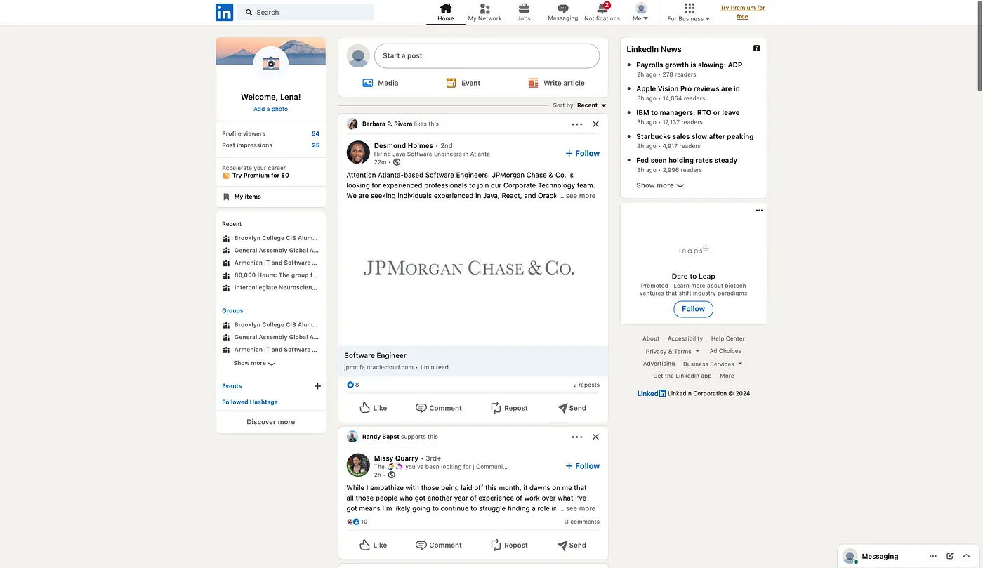 And back to the main feed — I’ve never utilized the left section to check the groups I belong to, as it doesn’t provide much utility for my needs. The LinkedIn News headers rarely capture my interest, and I tend to disregard the sponsored post on the right side. A significant portion of this screen real estate remains unused, overlooked, and untouched. Recommending a customizable feed feature would be beneficial, allowing users to tailor their experience by including sections that matter to them, such as a dedicated area for saved posts, job listings, and other relevant content.
