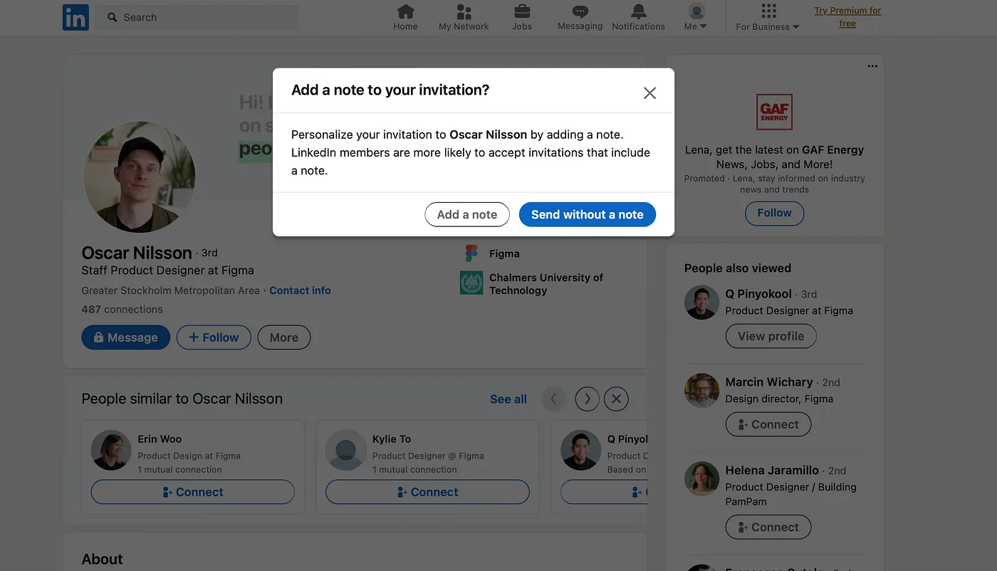 The primary means of reaching out to someone you don’t know without LinkedIn Premium is by sending a connection request. Though, you do have an option to personalize your invitation with a note, limited to 200 characters. That doesn’t leave much room to convey your message or explain why you want to connect.