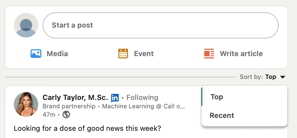 Implementing more robust content filters that empower users to sort their feed based on specific criteria like relevance, industry, or content type would be highly beneficial. This feature allows users to customize their feed to align with their professional interests. Currently, the default view is set to “top,” with the alternative being “recent.” The top feed tab predominantly displays posts with high interactivity or those from 1st-degree connections.