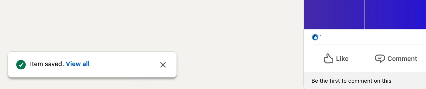 Posts: On your main feed is where you see all your posts from your 1st, 2nd and 3rd degree connections. You can click on the three vertical ellipsis on the top right of each post which will show you more options. Once that’s clicked, you can save the post. After that, you get a notification on the bottom left corner of your feed that states that the item has been saved, with a hyperlink to view all. Clear and immediate feedback is crucial for this workflow.
