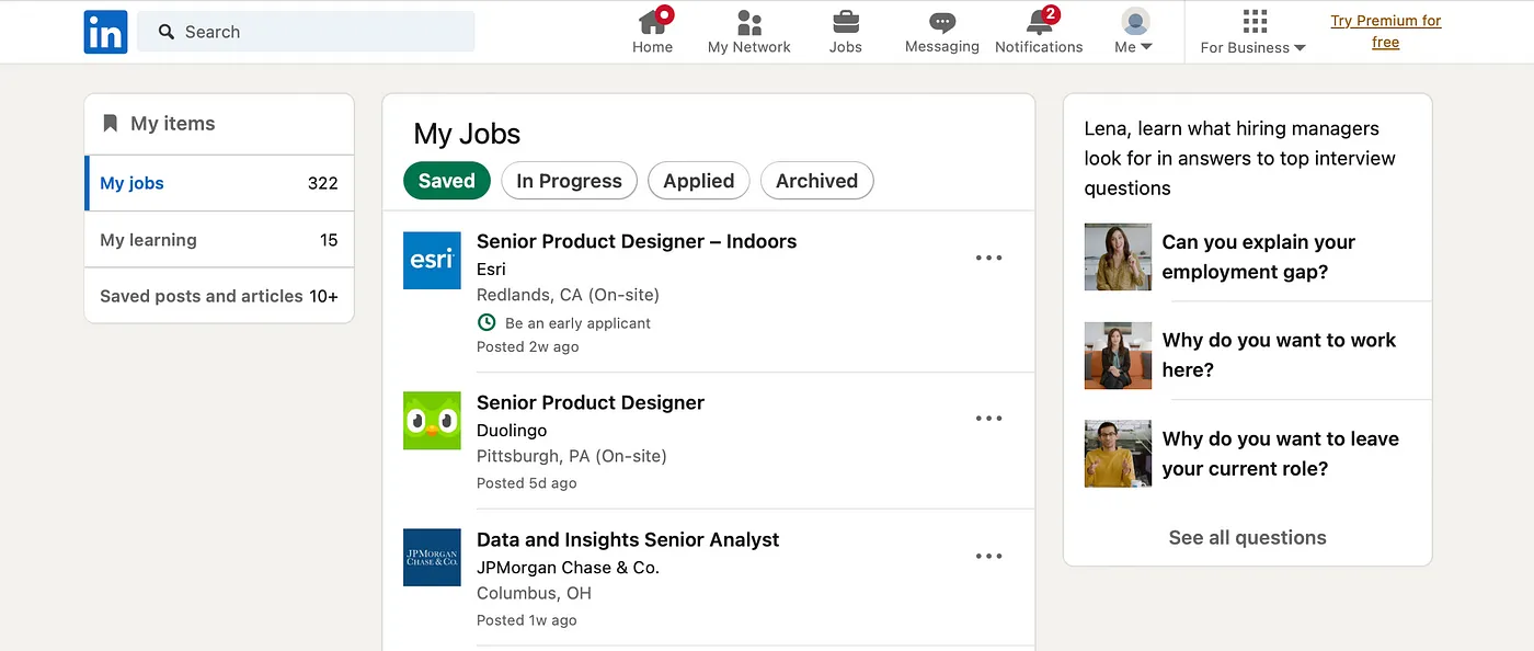 The current approach, tucked away within the “jobs” section, is not only awkward but also goes unnoticed by many users. I stumbled upon the location of my saved items inadvertently while navigating the job section, where I intended to find my saved jobs but unexpectedly discovered a tab housing all my saved items.