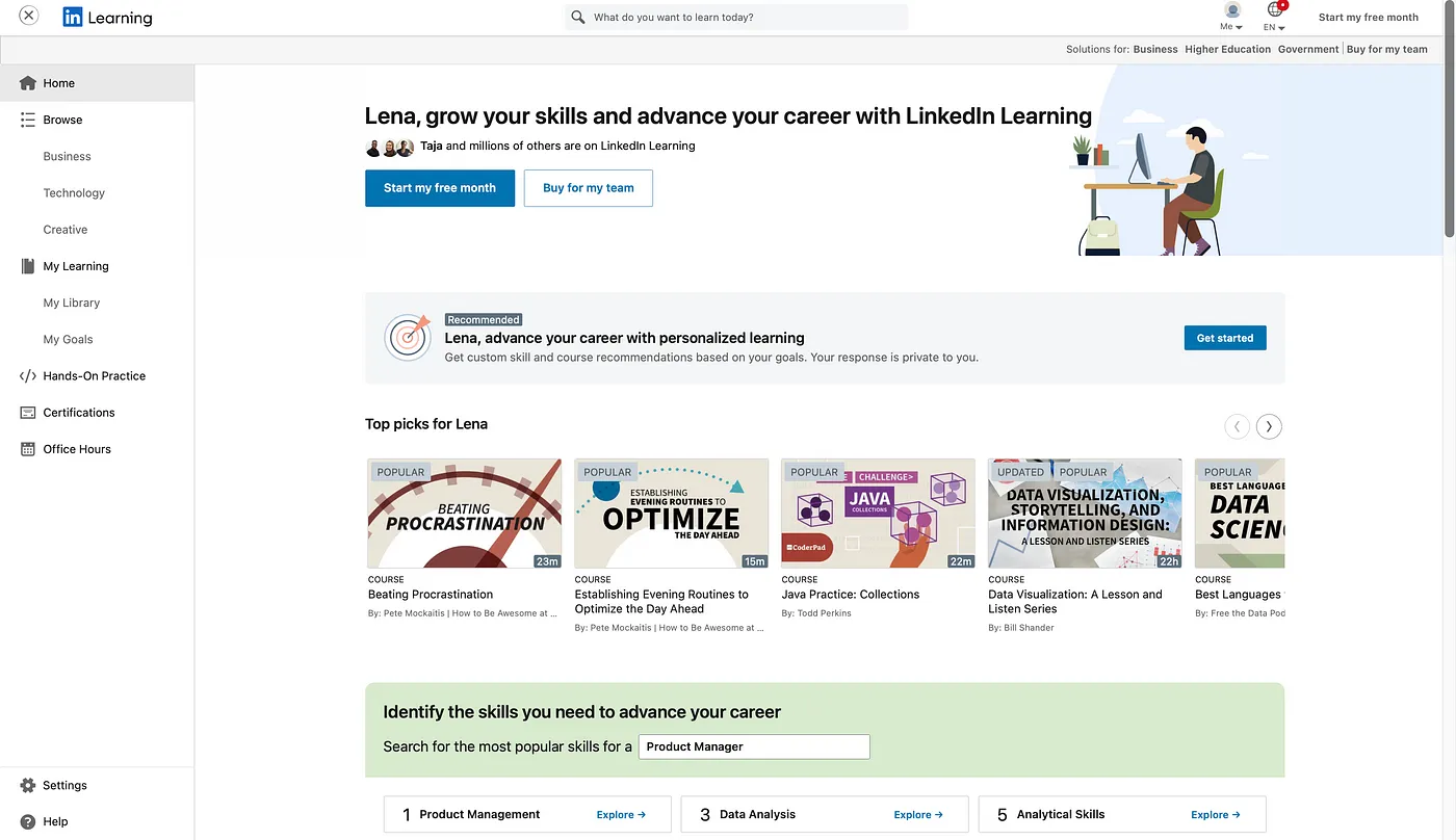 Once that’s clicked, a panel on the right side opens up, and under “For Business’, I found the Visit More LinkedIn Products header, where there are a few icons listed underneath, one of them being LinkedIn Learning. Once that’s clicked, it sends me to the LinkedIn learning platform on a new tab, which I know is related to Linkedin since the icon is there, but it looks like another platform entirely, even though the link reads