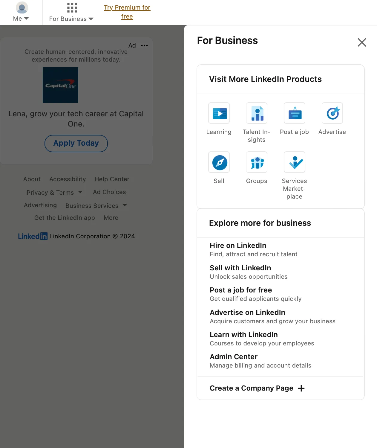 After some digging around in the header, I found that LinkedIn learning is under the “for business” tab. This user flow underscores a visibility and accessibility concern. It seems counterintuitive for a learning platform for users to be nested under the “For Business” tab, potentially leading users, like myself, to bypass it altogether.